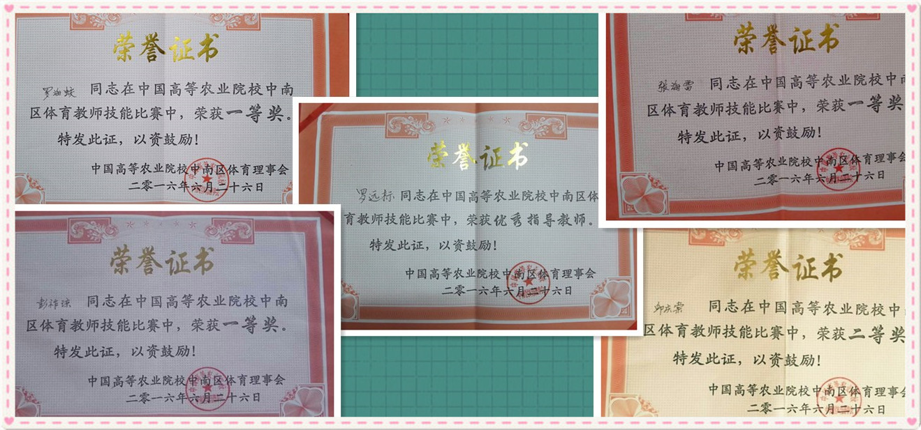 2016年6月25日-26日,由中国高等农业院校中南区体育理事会主办的中国高等农业院校中南区体育教师技能比赛在河南信阳农林学院进行,共有Beat365唯一官方网站、华南农业大学、华中农业大学等11所高校106名教师参加比赛。Beat365官网体育部教师罗海蛟、张海雷、彭祚琼分别荣获足球、篮球、排球项目一等奖,邱庆堂荣获篮球项目二等奖,罗远标主任荣获优秀指导教师奖,为Beat365官网争得了荣誉。